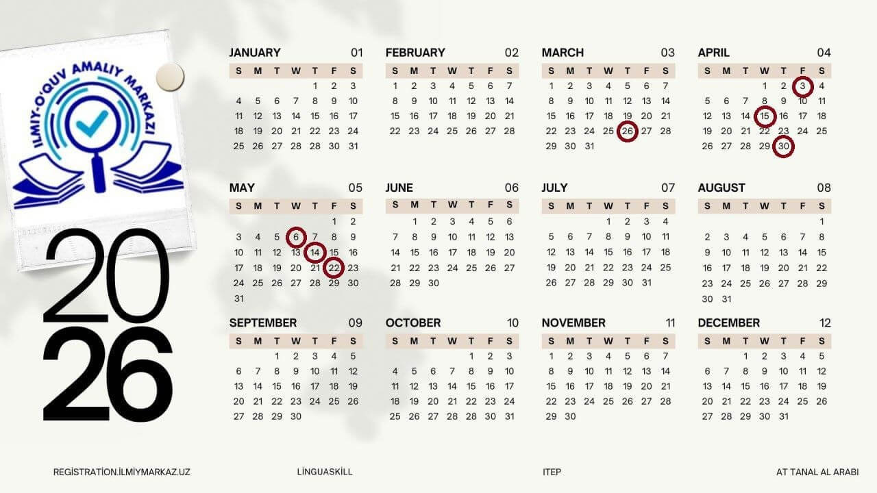 Agar siz ingliz yoki arab tili bo‘yicha o‘z darajangizni xalqaro miqyosda tasdiqlashni rejalashtirgan bo‘lsangiz, ushbu sanalarni kundaligingizga qayd etib qo‘ying.