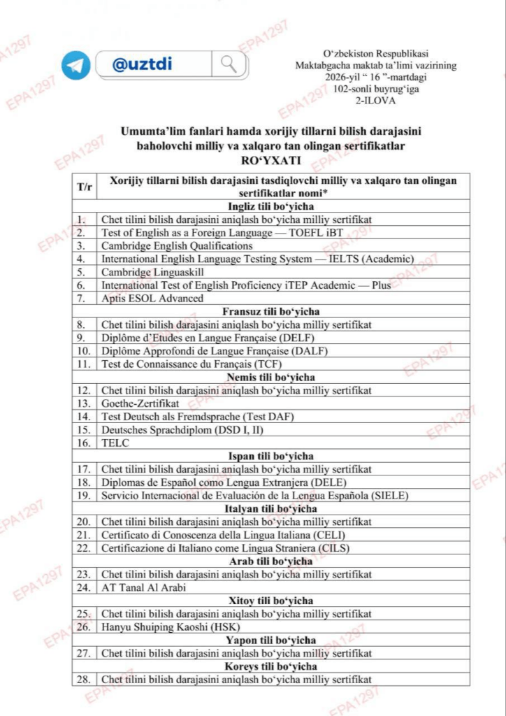 Maktab bitiruvchilari uchun yilning eng muhim yangiliklaridan biri e’lon qilindi. Maktabgacha va maktab ta’limi vazirining 2026-yil 16-martdagi 102-sonli buyrug‘i bilan yakuniy imtihonlardan ozod etish huquqini beruvchi sertifikatlar ro‘yxati rasman tasdiqlandi.
