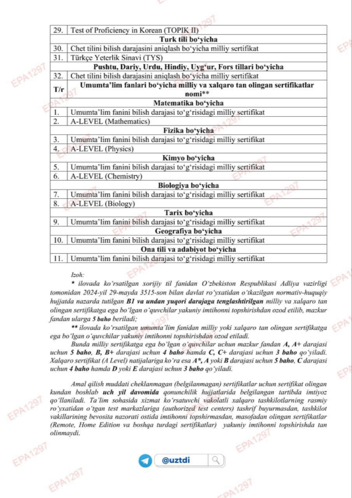 Ushbu hujjatga ko‘ra, ma’lum darajadagi milliy yoki xalqaro sertifikatga ega o‘quvchilar tegishli fan bo‘yicha imtihon topshirmaydi va ularga avtomatik ravishda yuqori ballar qo‘yiladi.