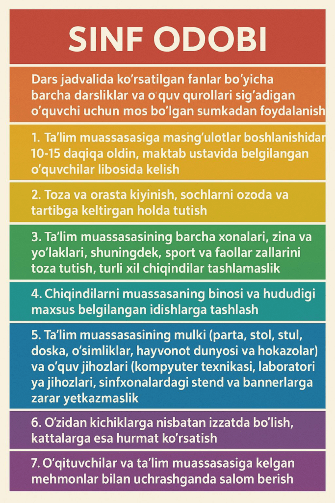 - mashg‘ulotlar boshlanishidan 10–15 daqiqa oldin, maktab ustavida belgilangan o‘quvchi formasida kelish;