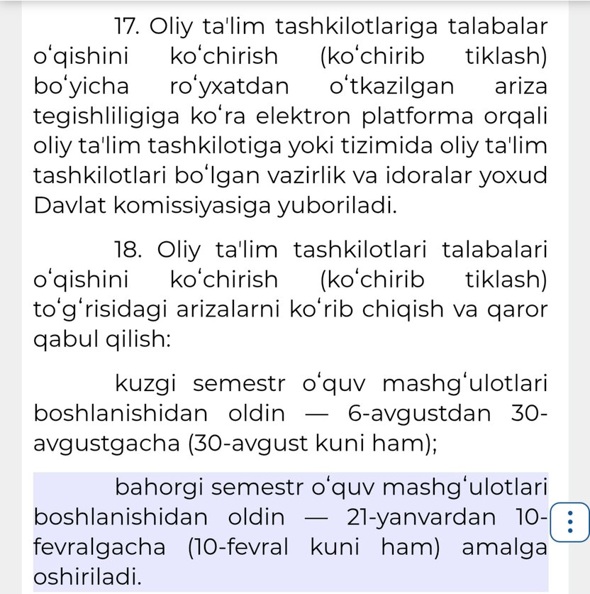 Oliy ta’lim muassasalariga o‘qishini ko‘chirish istagida bo‘lgan talabalar uchun muhim xabar! Vazirlar Mahkamasining 2025-yil 13-sentyabrdagi 578-sonli qaroriga ko‘ra, bahorgi semestr (qishki perevod) arizalari bo‘yicha yakuniy javoblar e’lon qilinishiga sanoqli kunlar qoldi.